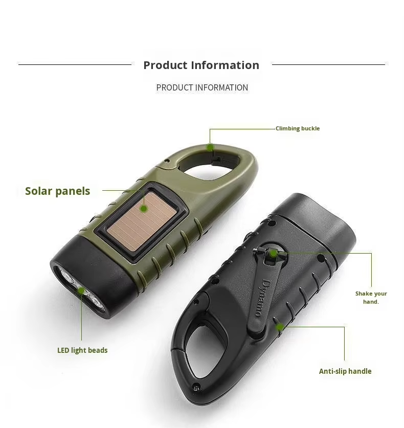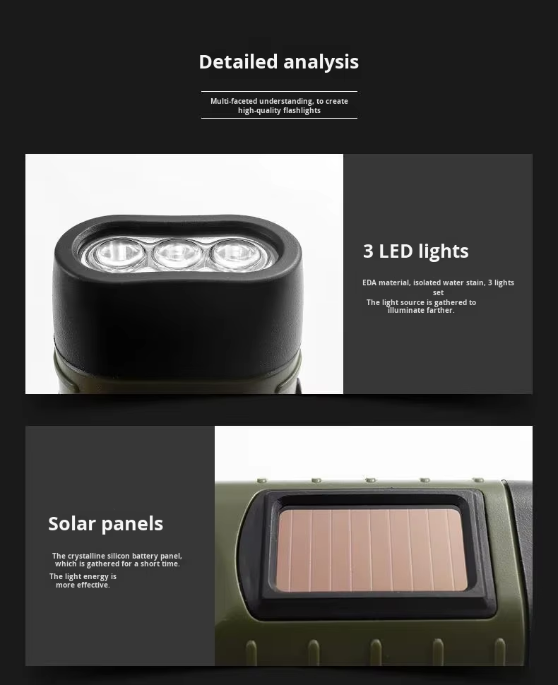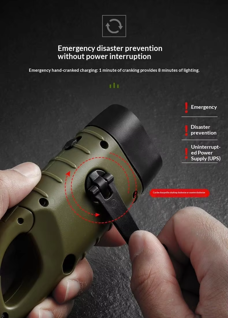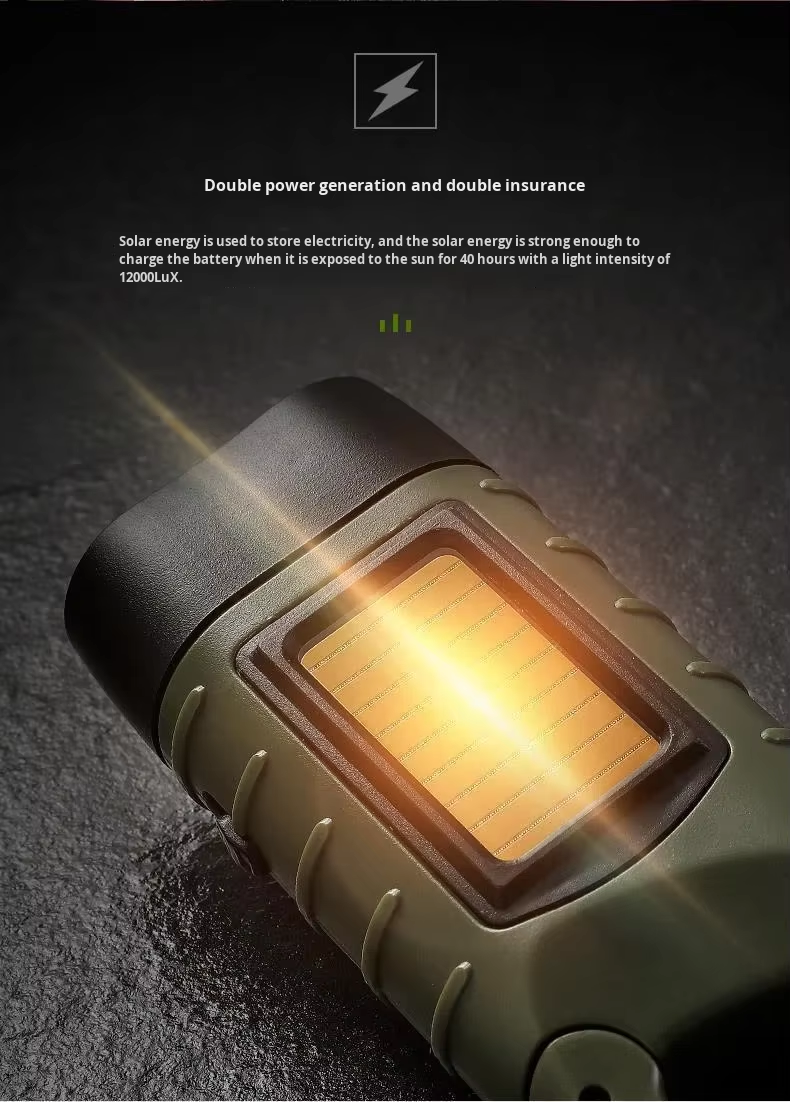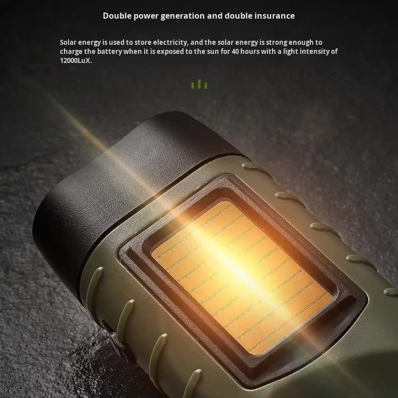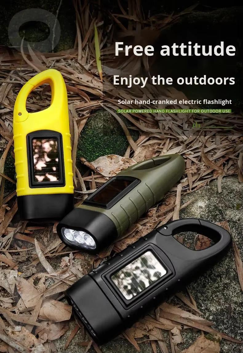 Solar-powered hand-crank torch with an aluminium alloy casing and LED emergency light, ideal for outdoor camping and portable manual lighting