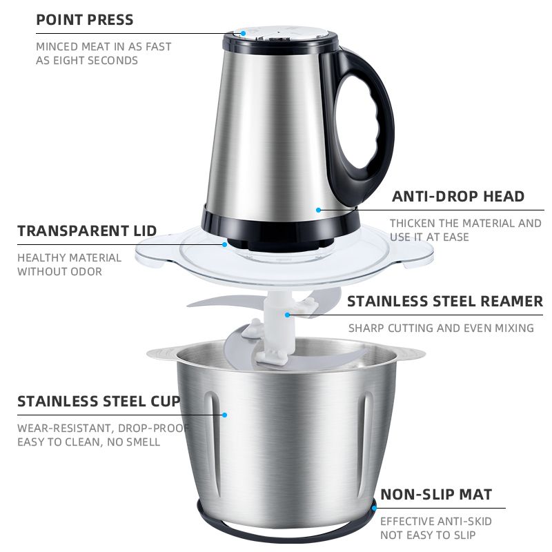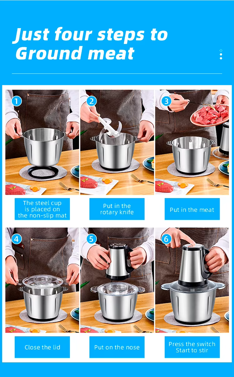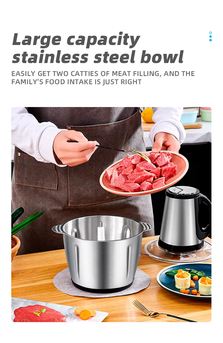This 3L stainless steel electric meat grinder is suitable for both domestic and commercial use. Its powerful motor delivers fast mincing and mixing, offering high efficiency and noticeably improved results. Multiple safety features ensure secure operation, making it ideal for preparing all kinds of ingredients.
