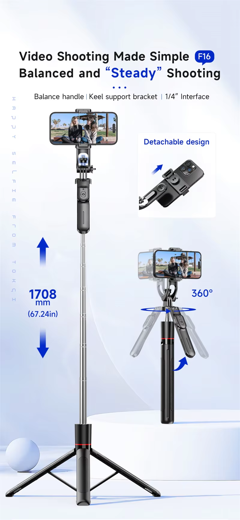 F16 Detachable Mobile Phone Mount with 360-Degree Panoramic Selfie Stick