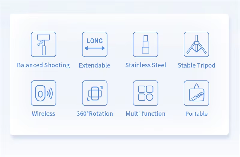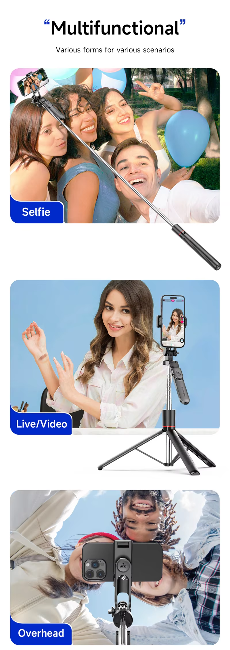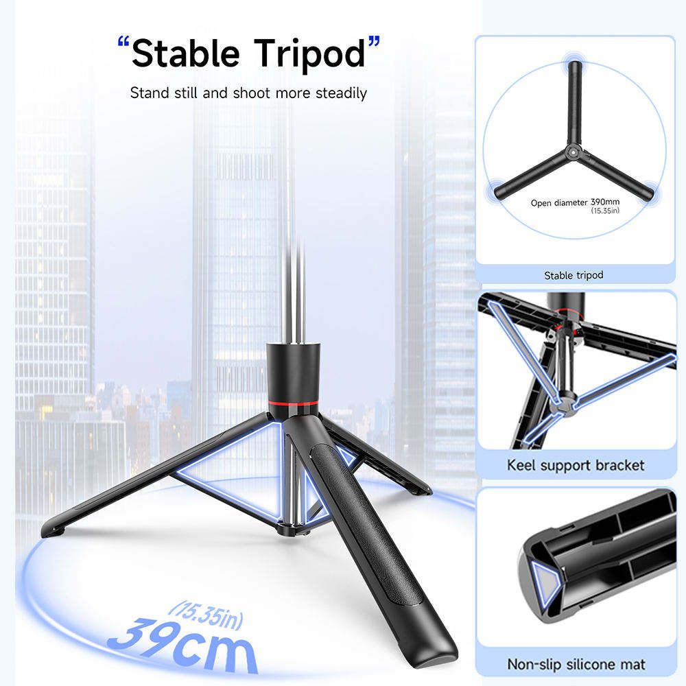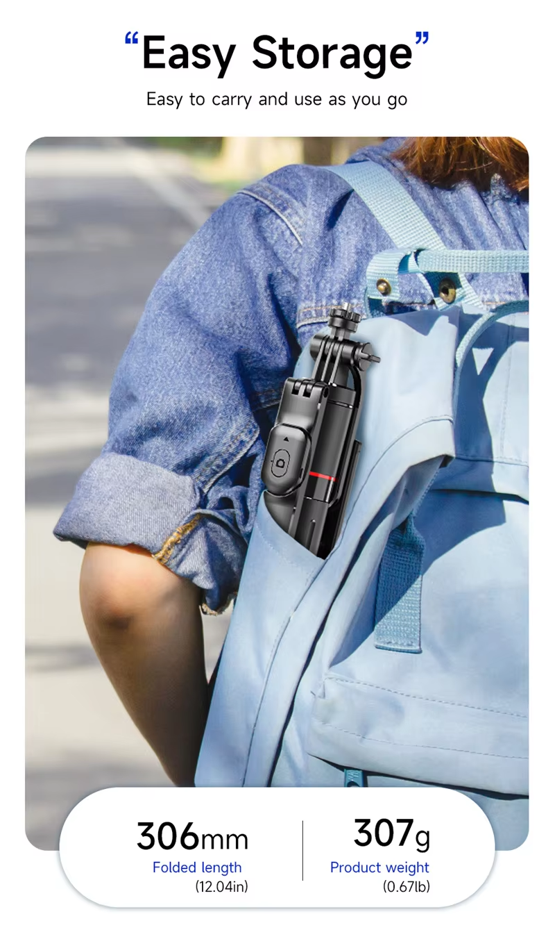This multifunctional folding tripod combines a selfie stick with stable filming. Extending up to 1708mm, it supports 360-degree panoramic rotation and, with the wireless remote, enables easy long-distance video recording with your phone. It folds into a compact, portable size, perfectly combining the convenience of a selfie stick with the balance of a tripod.