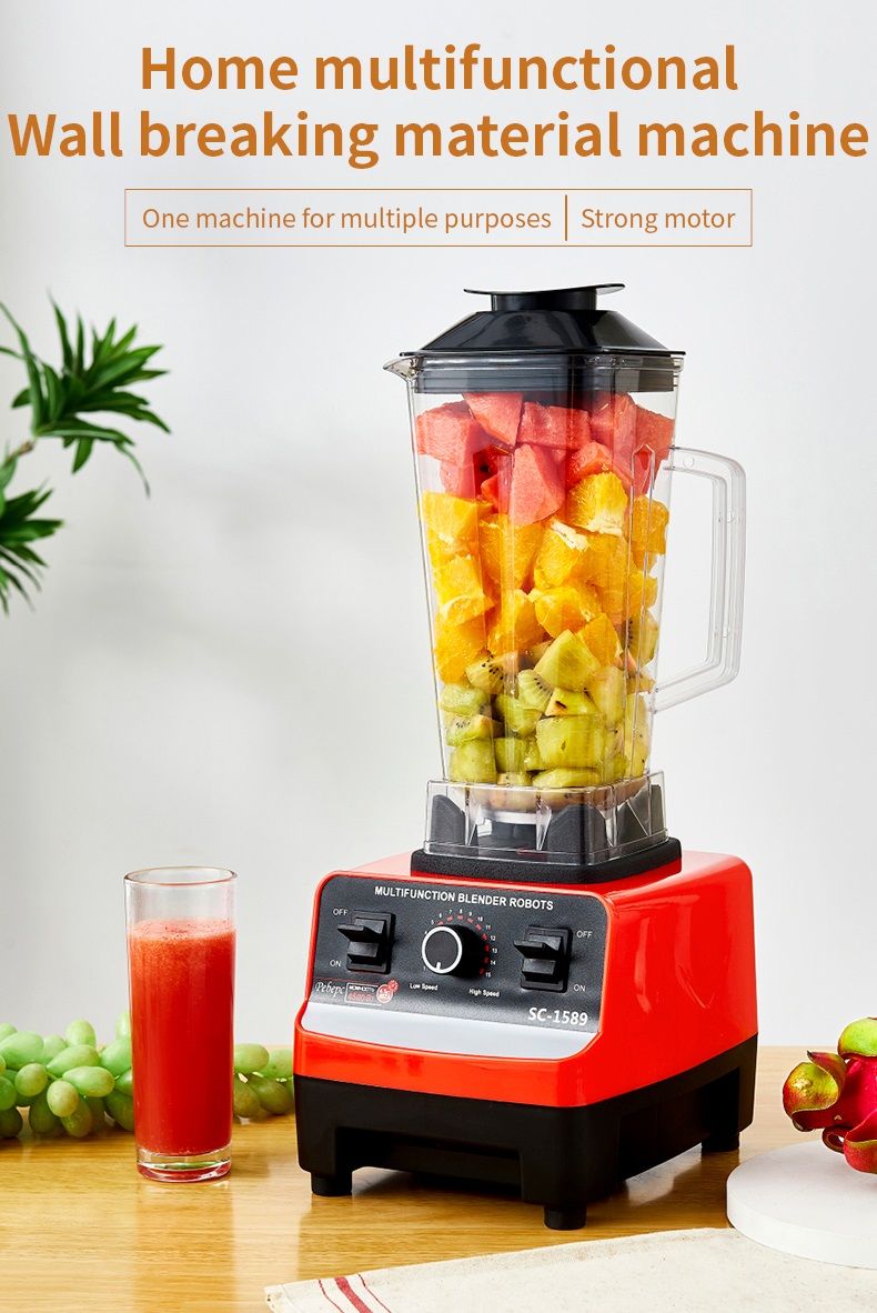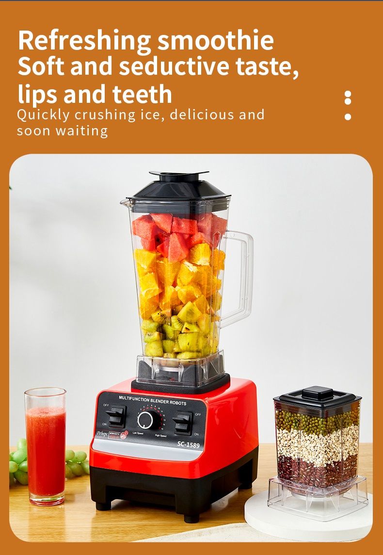 This high-quality commercial and home blender is a 3-in-1 machine that handles juicing, mincing, and mixing. It features a large capacity, variable speed control, and a built-in heating function. This versatile all-in-one appliance meets all your kitchen needs, whether at home or for commercial use.