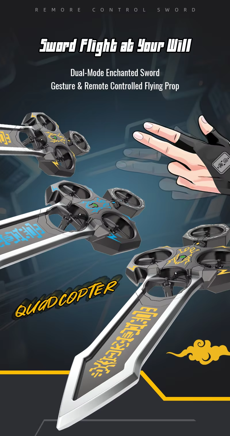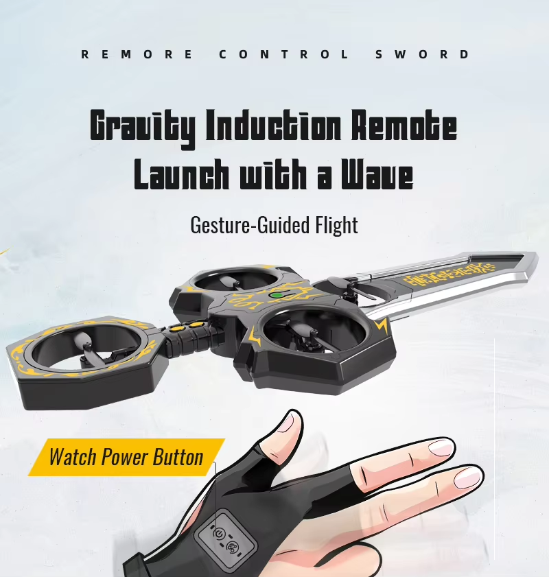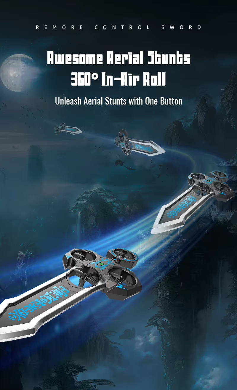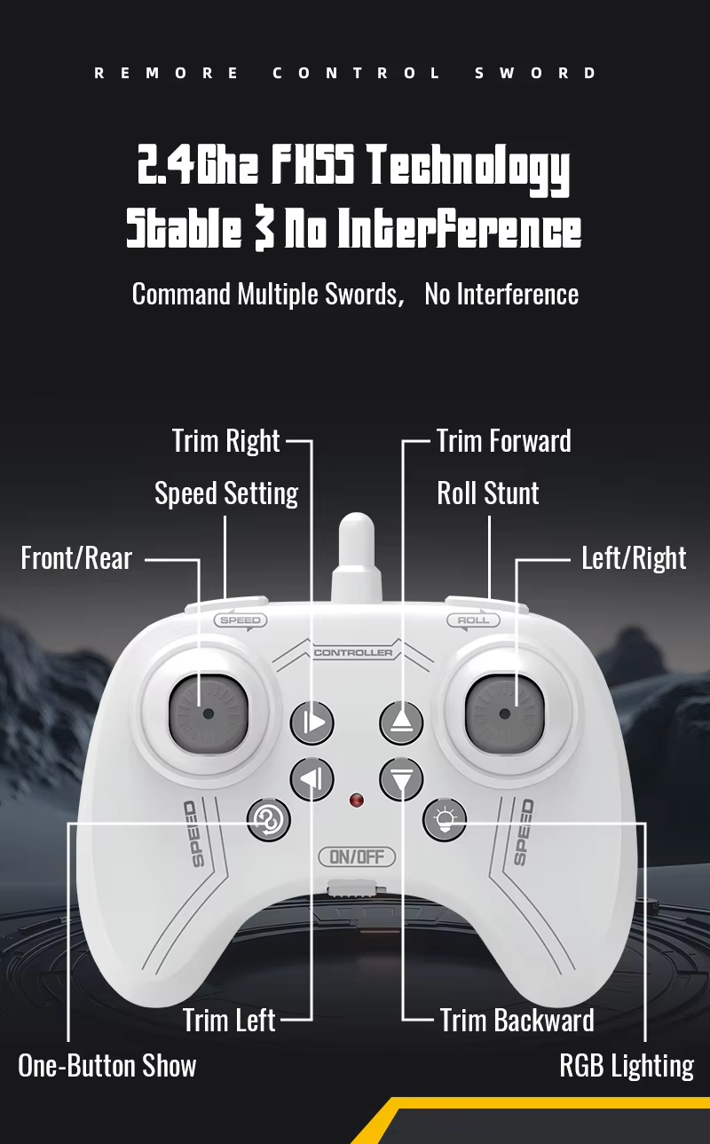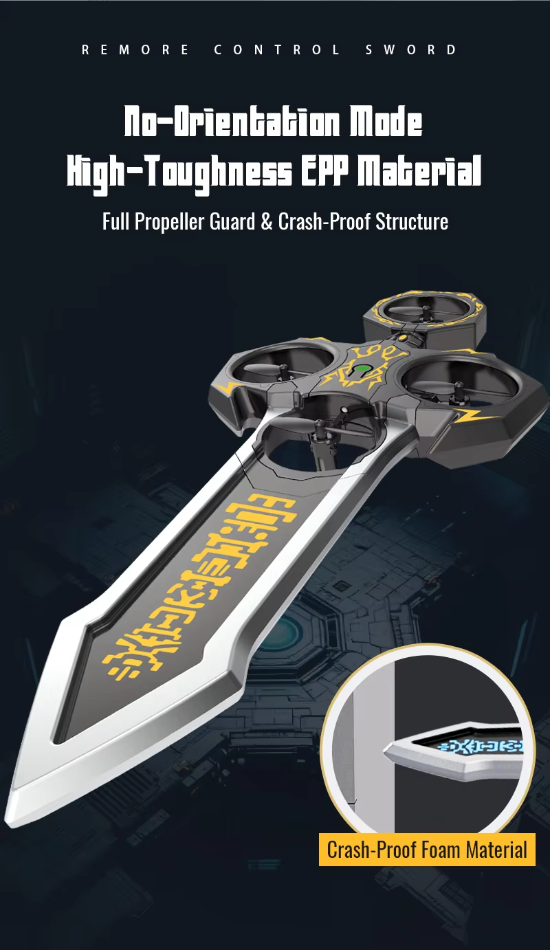 Remote-controlled flying sword toy with colour-changing lights and manual launch button, one-touch flip