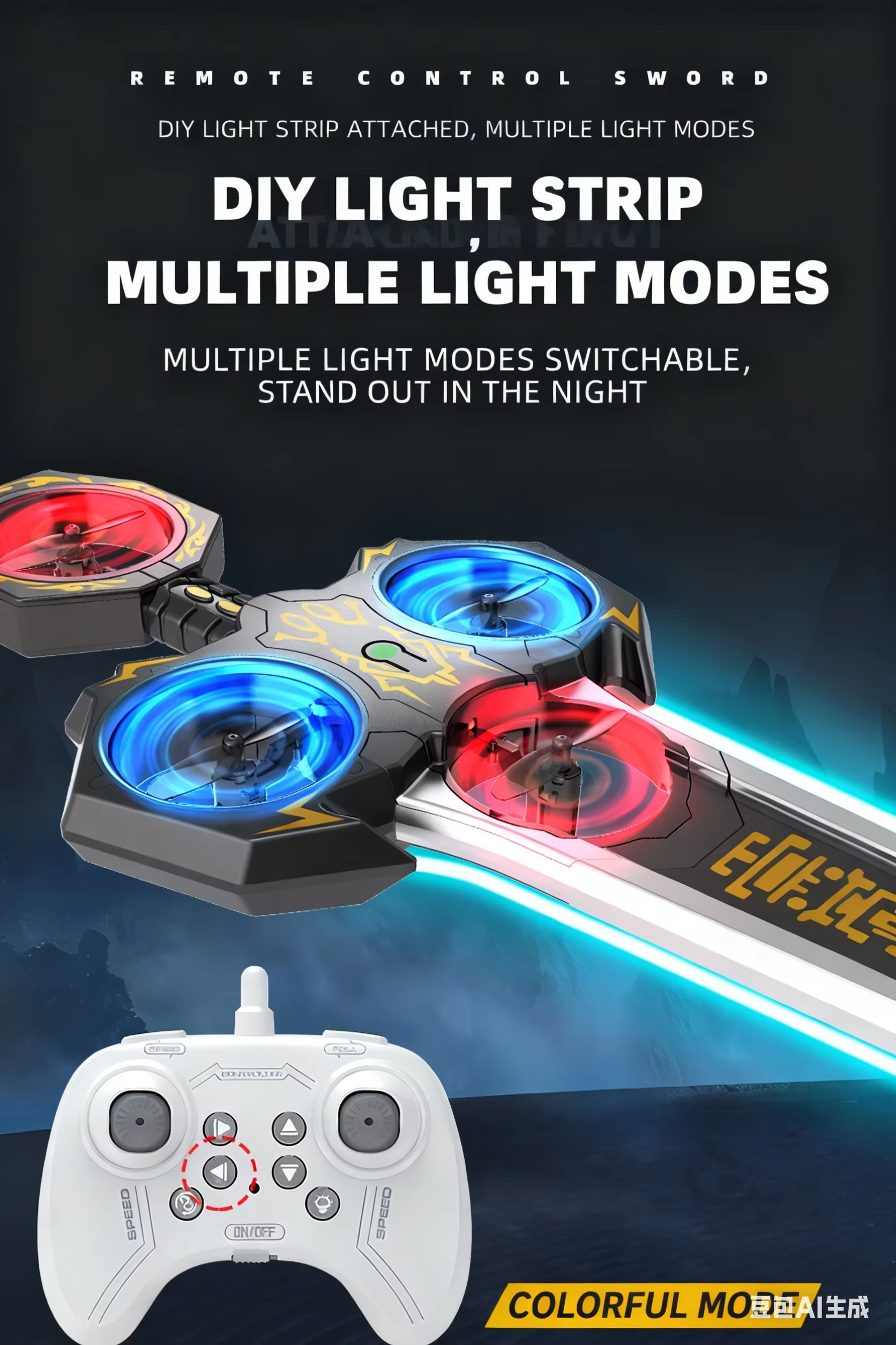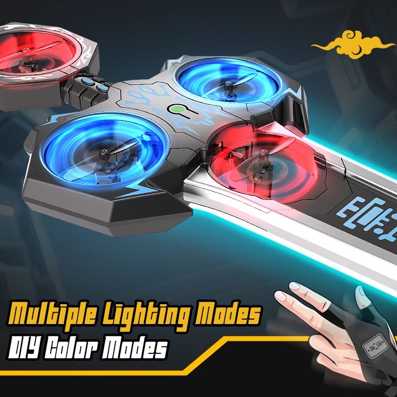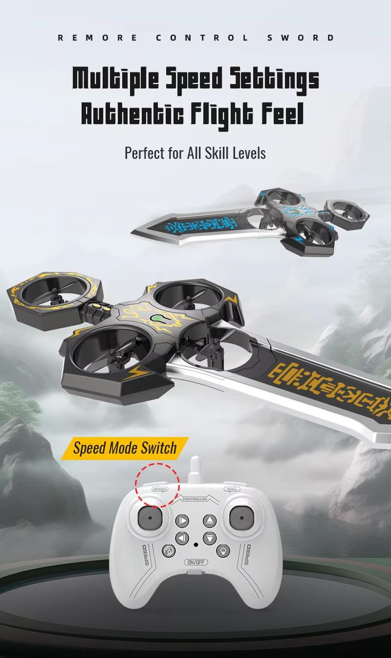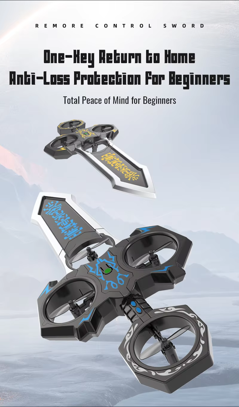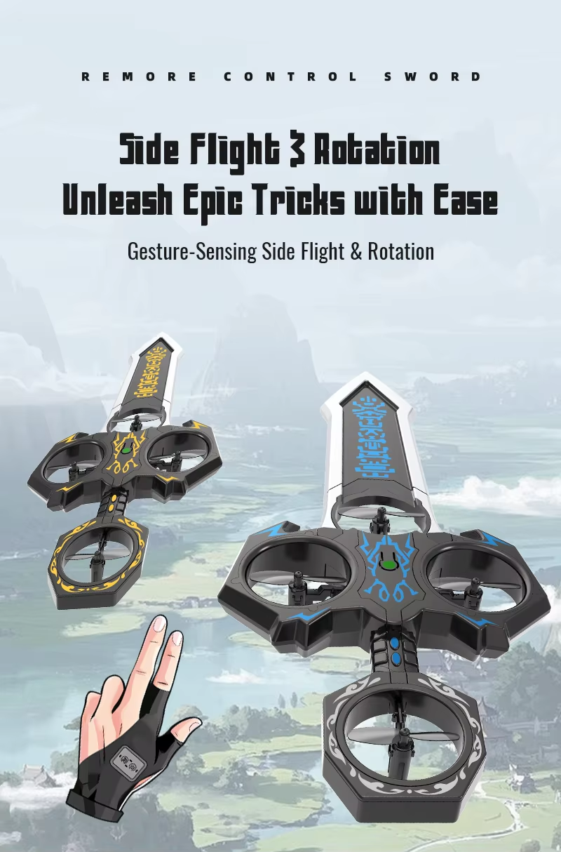 Remote-controlled flying sword toy with colour-changing lights and manual launch button, one-touch flip