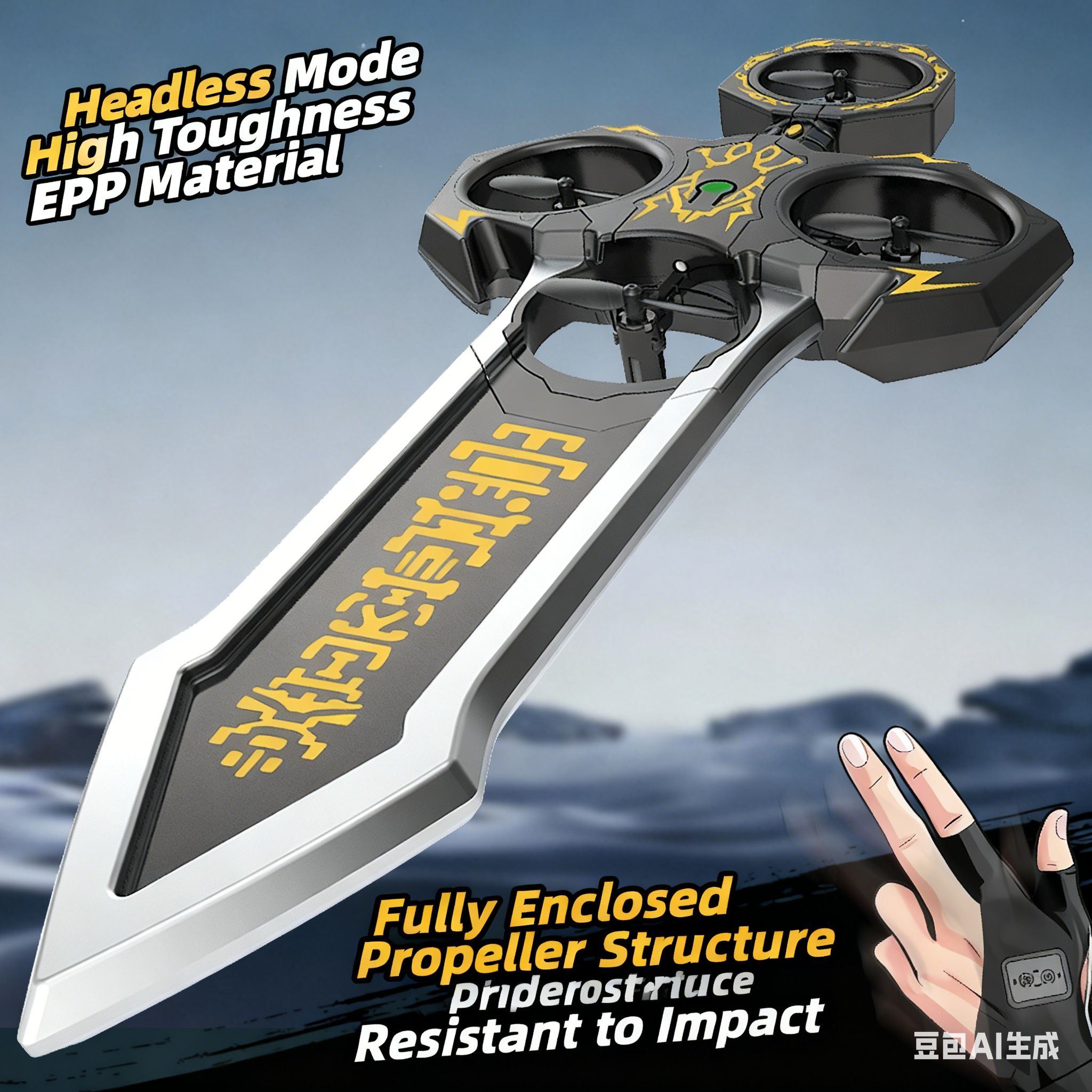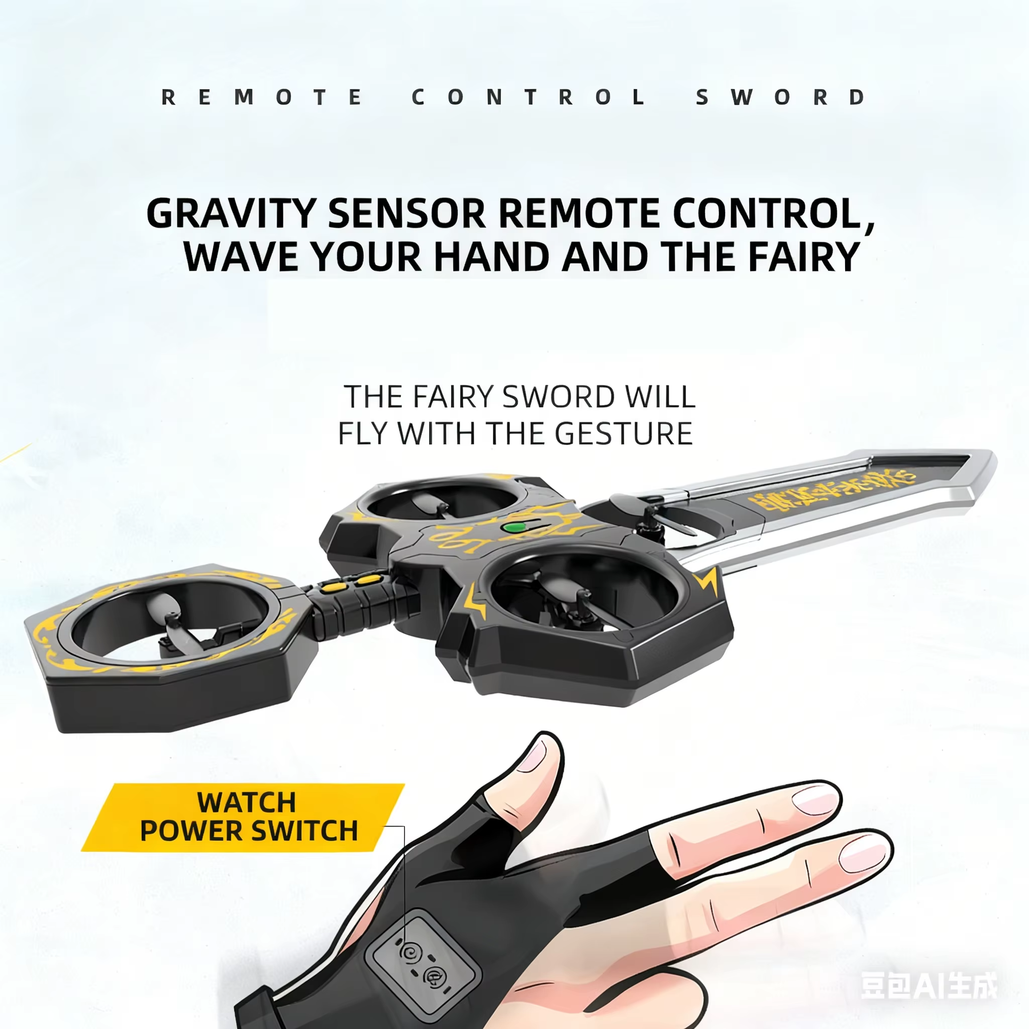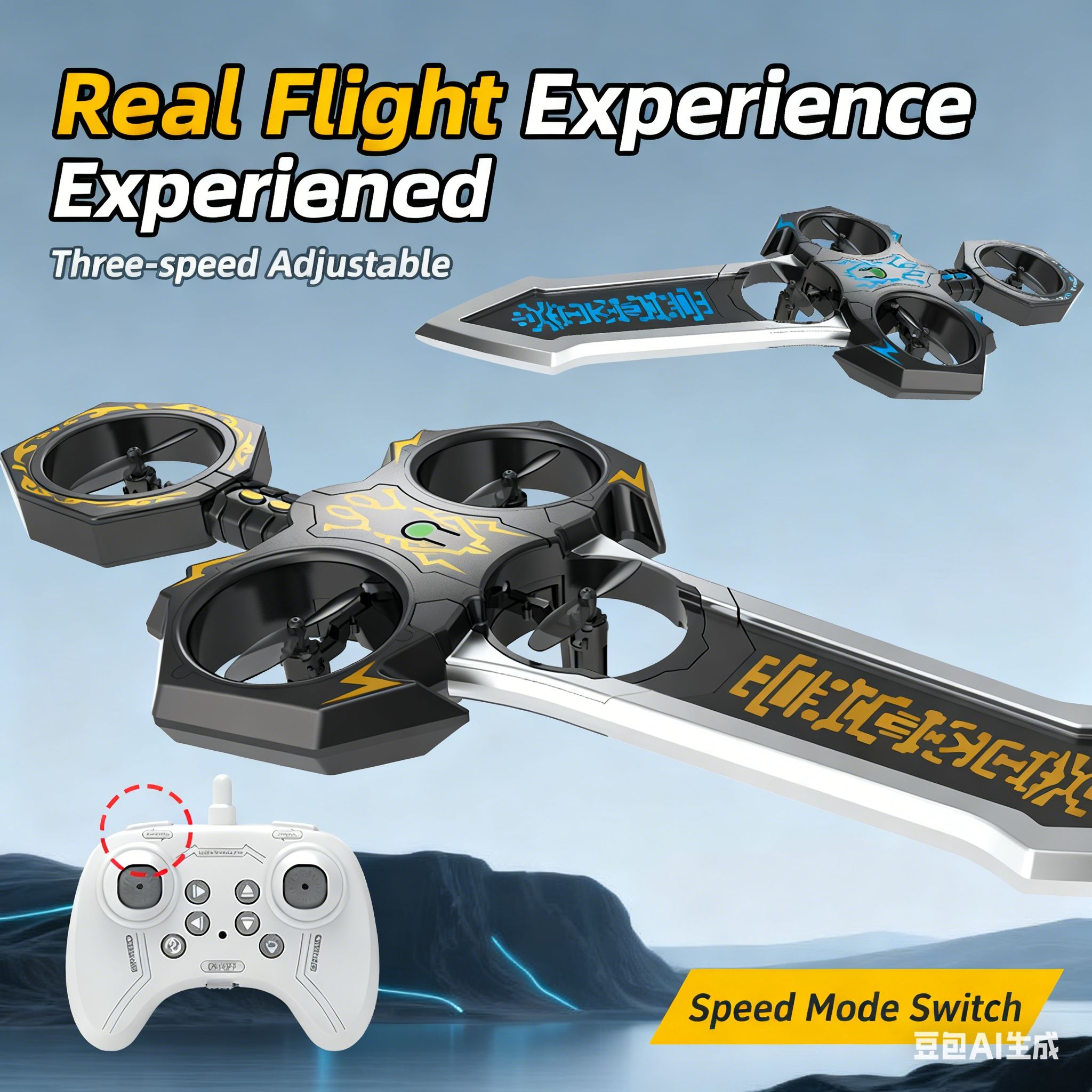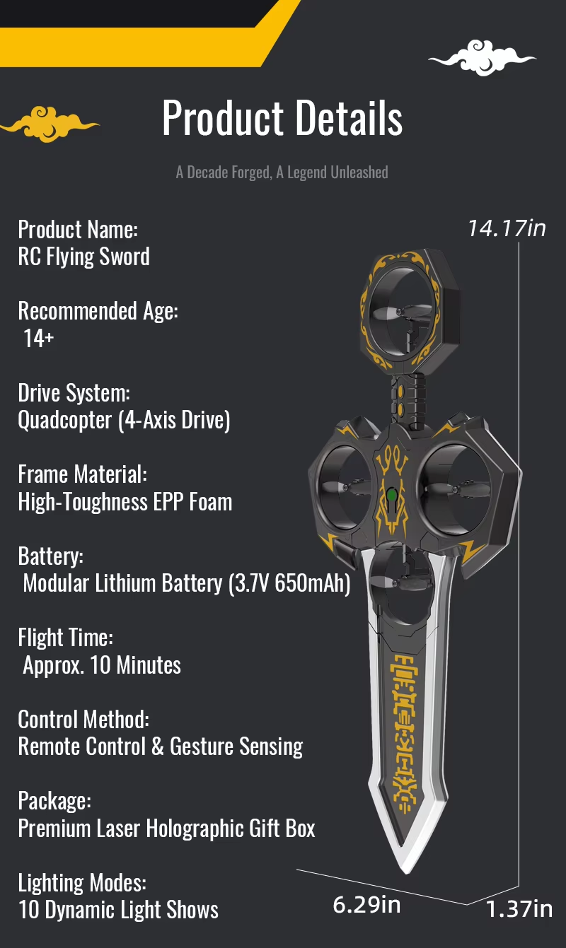 Remote-controlled flying sword toy with colour-changing lights and manual launch button, one-touch flip
