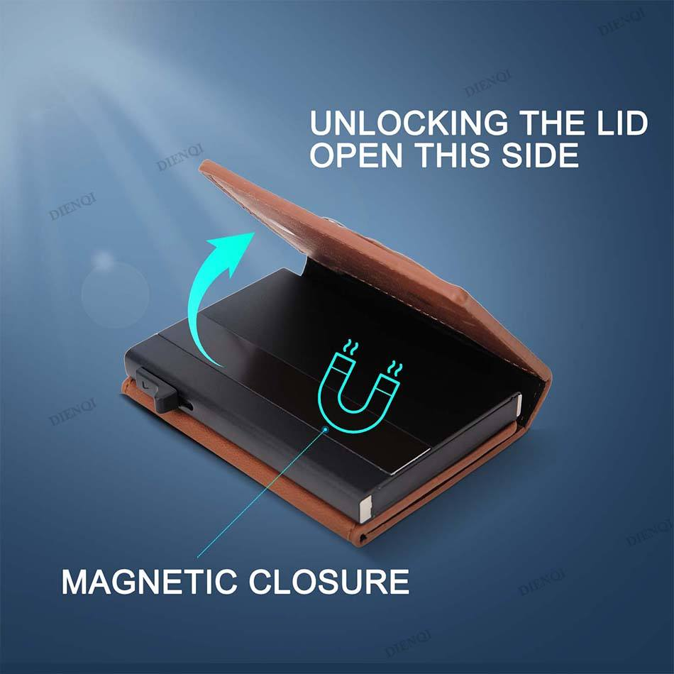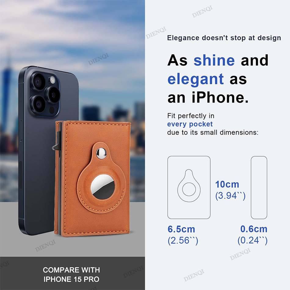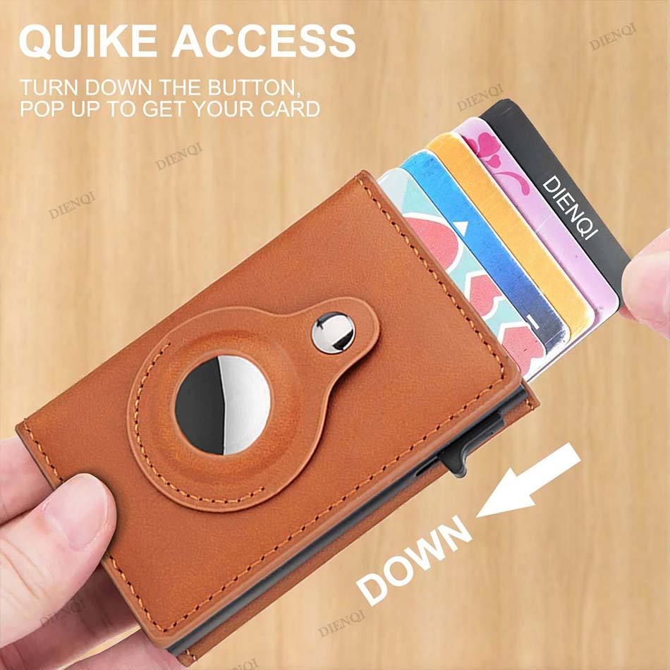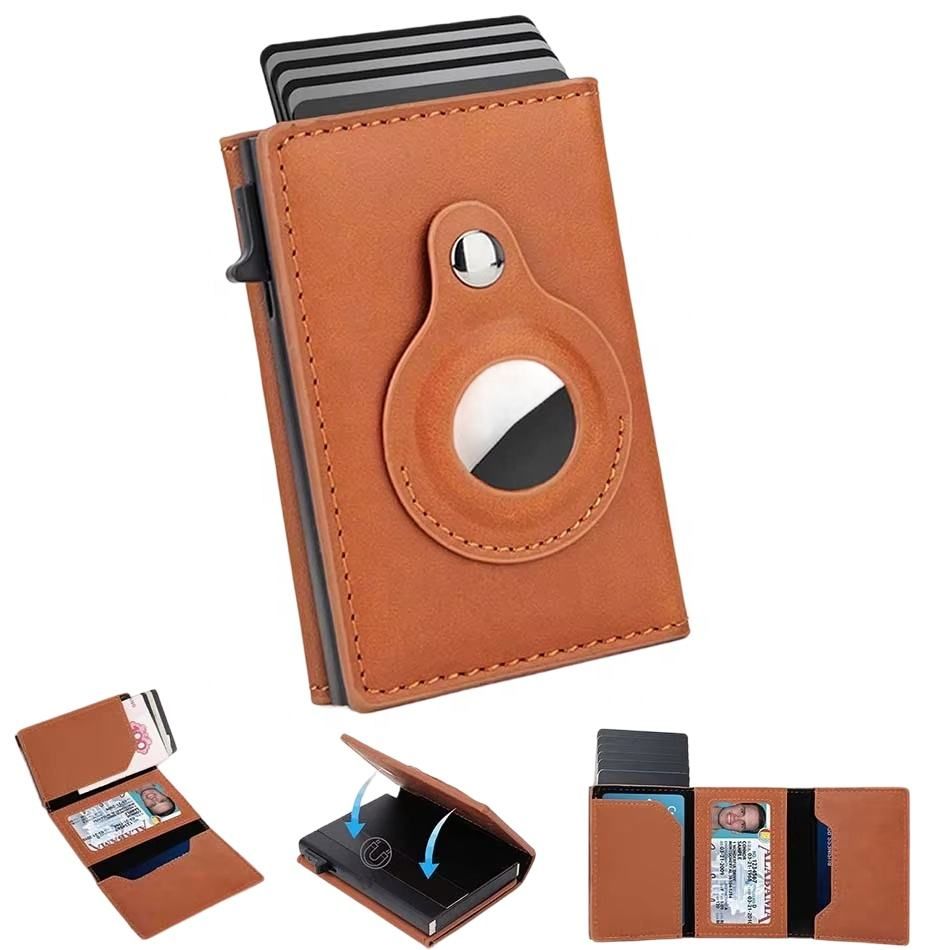 RFID blocking luxury men's wallet with automatic metal aluminum cardholder box, faux leather, Apple Tracking, and AirTag compatibility.